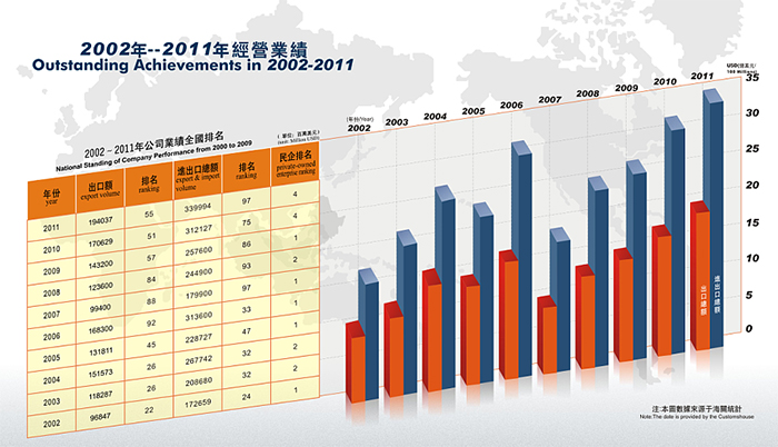 近年來,公司發(fā)展勢頭良好, 2014年公司實際出口額達(dá)到10.5億美金,排名“2014中國出口200強”第192名,其中民營企業(yè)排名第21名。公司先后獲得 “中國守合同重信用企業(yè)”、 “廣東省先進(jìn)集體”、“廣東省優(yōu)秀民營企業(yè)”、“東莞市50強民營企業(yè)”,“東莞市文明單位”等稱號,公司被東莞市政府授予“東莞市50強民營服務(wù)業(yè)企業(yè)”光榮稱號,公司董事長陳海生被授予“東莞市優(yōu)秀民營企業(yè)家”光榮稱號。